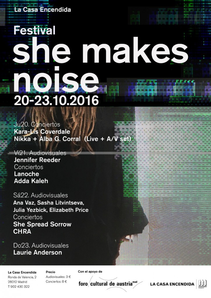 Por fin, después de mucho trabajo de campo puede anunciarse todo el programa completo este mes. La primera edición, como bien dices, fue un gran éxito, quizás un tanto insesperado dado lo especial de la propuesta y se hacía necesaria una segunda para darle continuidad y apoyo al proyecto. Cambiamos fechas, de primeros de año a últimos, ya queda nada para disfrutar, será del 20 al 23 de octubre y estáis todas más que invitadas. El festival crece, de 4 actuaciones en directo pasamos a 6, se mantiene el ciclo de cine con estrenos únicos en Madrid y se ha potenciado el taller sonoro con respecto al año pasado. Estoy muy contenta con como va todo y nerviosa también a medida que se acerca la fecha, eso es inevitable. Creo que es un festival multidisciplinar, único en sus temáticas en todo el mundo y que hemos hecho con una gran coherencia, seriedad y respeto por la idea original. Os animo a descubrirlo a través de la web de LCE y la propia del She Makes Noise para estar al tanto de todo y nos vemos en octubre en Madrid!!!