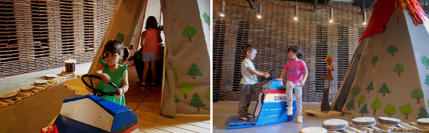 Finalmente, La isla de los sonidos es un parque de juegos sonoros que hicimos con otros dos colectivos con los que solemos colaborar desde hace años: DART y Súpermanazas. Juntos creamos un grupo de investigación llamado Pequeño Club Sonoro. Fue un proyecto que hicimos en su fase beta gracias a las Ayudas a la Creación del Ayuntamiento de Madrid y que partía de nuestra experiencia y la de los otros colectivos como madres, padres y gente interesada en la introducción de la enseñanza musical no ortodoxa a la infancia. Construimos un parque sonoro con materiales orgánicos a modo de isla, donde las niñas y los niños, mediante su juego simbólico y libre, generan música mediante sonidos previamente creados por ellos mismos en talleres de experimentación. Una instalación para tocar, jugar, generar músicas y ambientes. Todos los elementos que la conforman llevan integrados botones, altavoces, micrófonos o sensores controlados por un arduino. Lo presentamos y probamos con niños y niñas en Matadero Madrid en el verano de 2018, donde constatamos el uso feliz que hacían del espacio, pero también detectamos mejoras y posibles mutaciones. Fue un proceso muy arduo, hecho con muy poco presupuesto y mucho esfuerzo, que esperamos poder activar pronto, porque con este proyecto ha ocurrido un parón que no logramos entender muy bien y que necesitamos analizar a mayor profundidad. Pensamos que era un proyecto que iba a ser más sencillo y estimulante para reactivarlo pero lo cierto es que estamos analizando las razones por las que no ha tenido tanto movimiento como otros. Seguiremos trabajando en él.